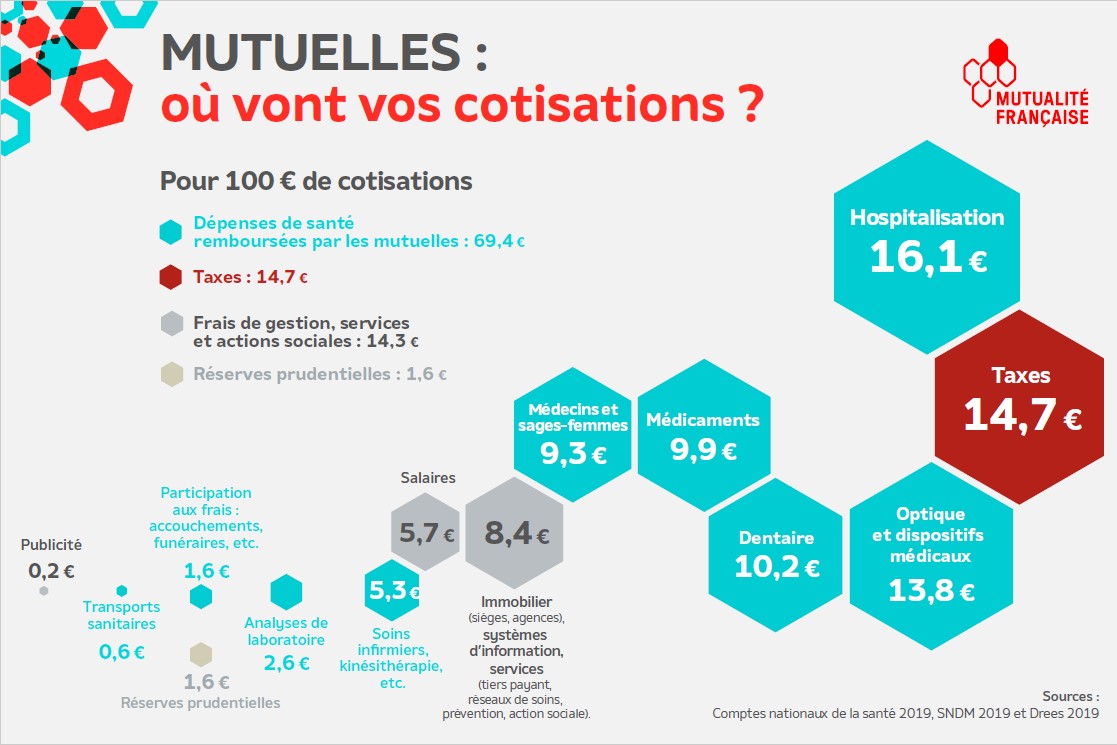 En 10 ans, les complémentaires santé ont augmenté leurs remboursements aux adhérents de 29 %.En 2019, les mutuelles ont reversé à leurs adhérents 79% de leurs cotisations(hors taxe) sous forme de prestations (hors frais de gestion des sinistres), plaçant leur retour sur cotisations devant celui des sociétés d’assurances (75%). Pour l’ensemble des organismes, la part des cotisations couvrant les charges de gestion s’établit à 20 %, alors que cette part descend à 19 % pour les mutuelles. De plus, pour la 2e année consécutive, les mutuelles ont vu leurs frais de gestion baisser de 1,4% en 2019.