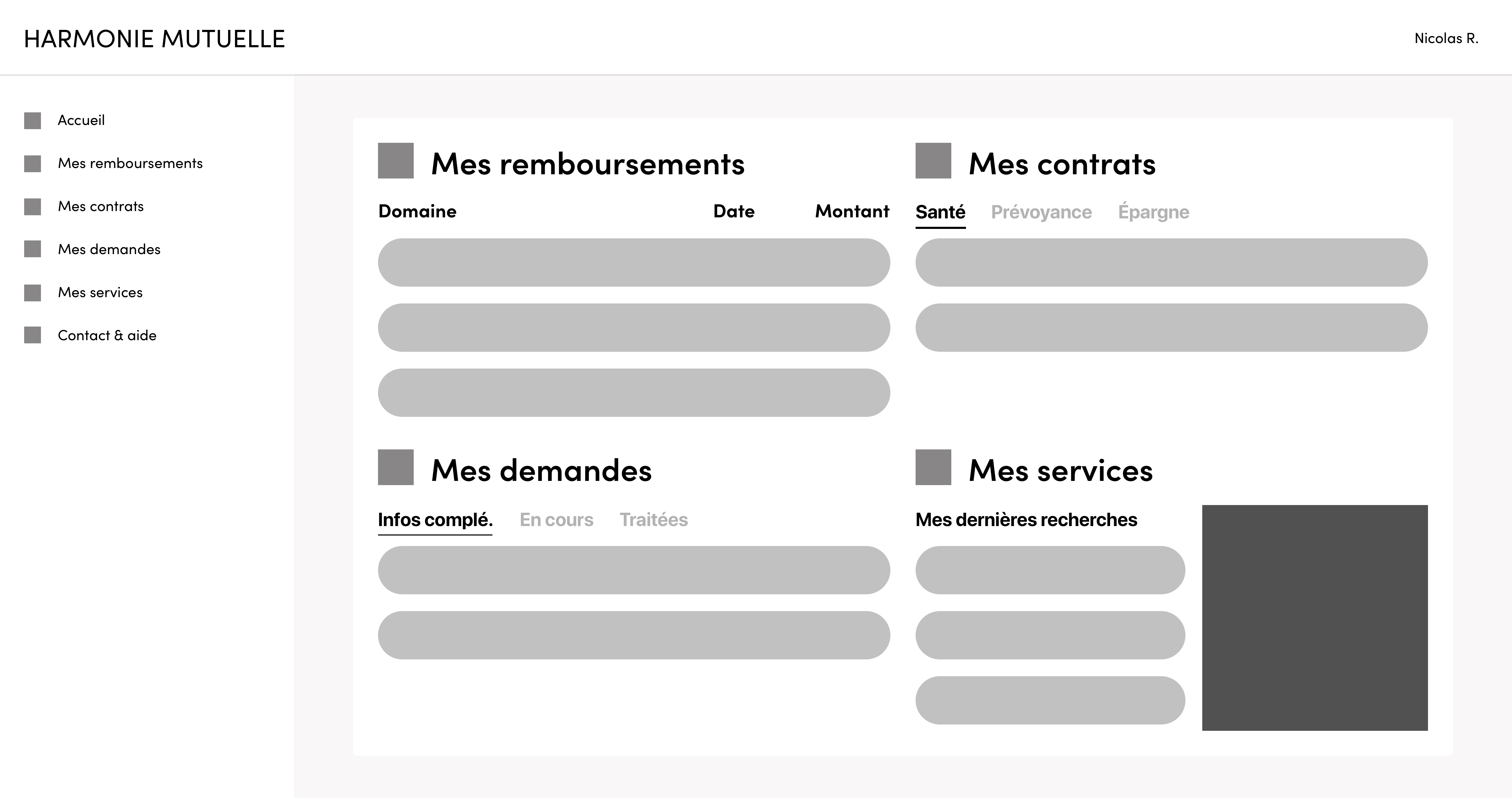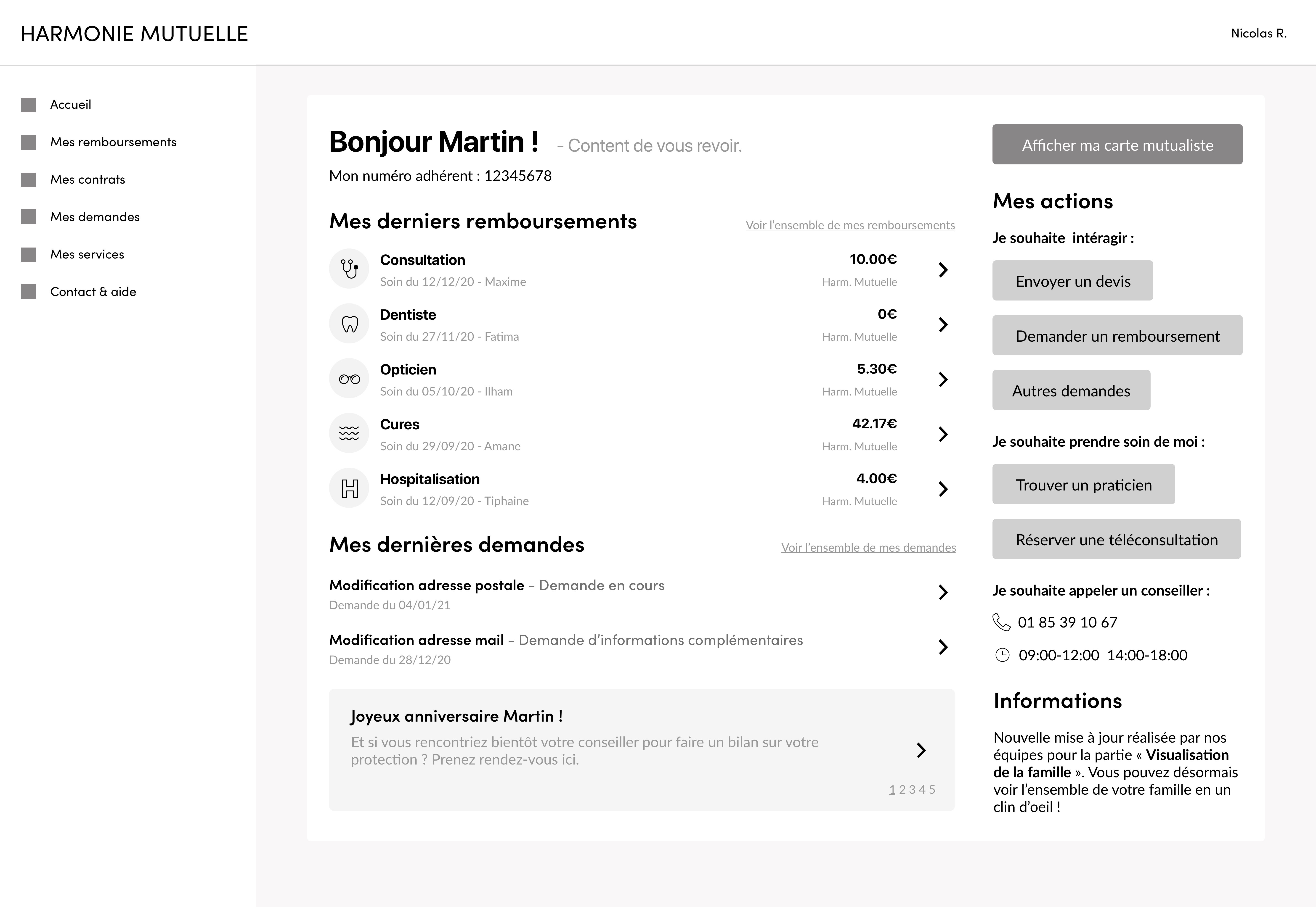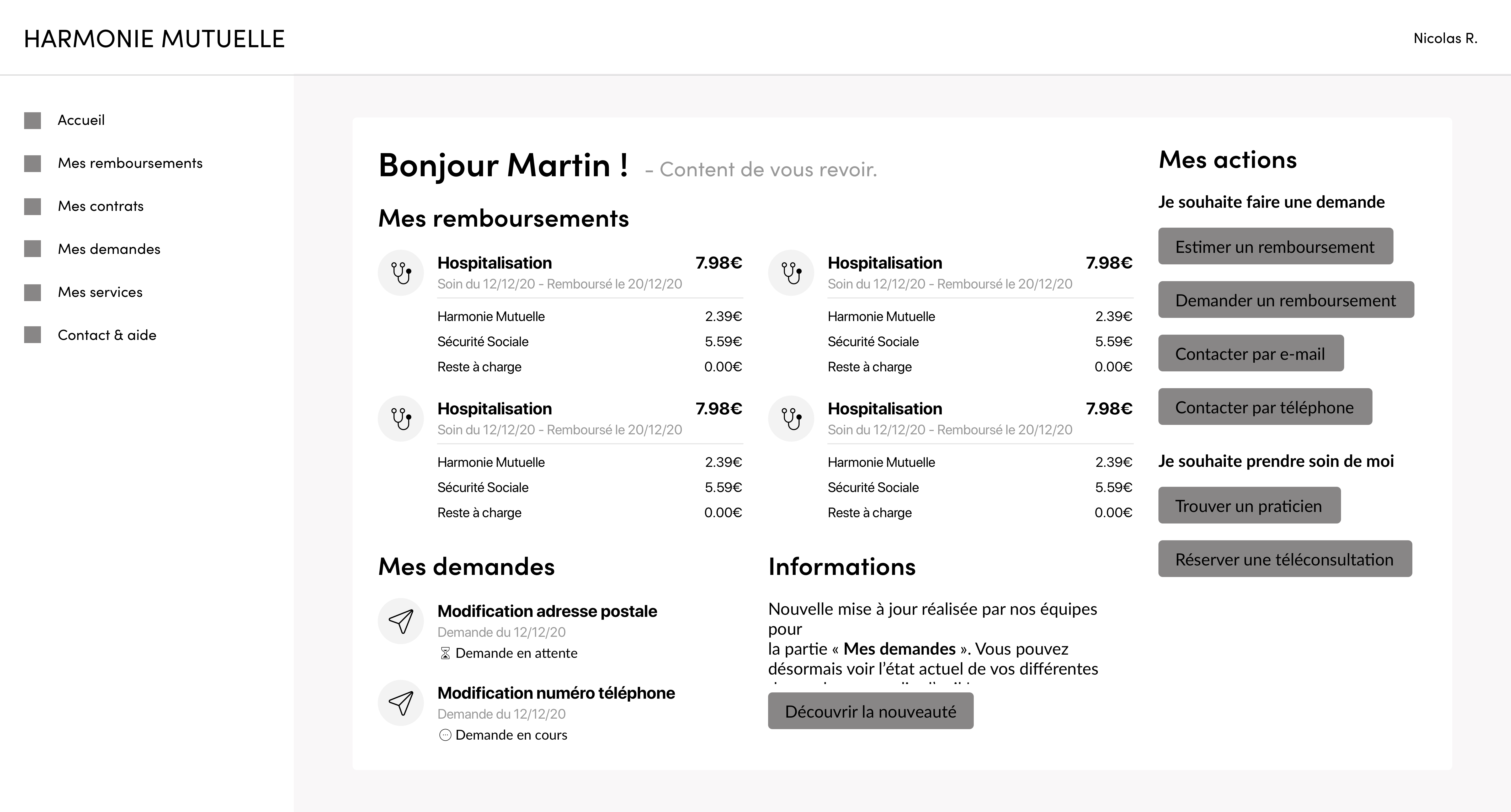 Le concept de cette page d'accueil est de permettre à l'utilisateur de visualiser ses dernières informations simplement et efficacement. Pour répondre à ce concept, je devais me poser la question de la pertinence des informations à afficher. J'ai d'abord défini les éléments, à savoir : les remboursements, les demandes, les contrats ainsi que les services. Après un atelier avec Fatima, j'ai itéré les éléments pour ajouter une liste d'action rapide.