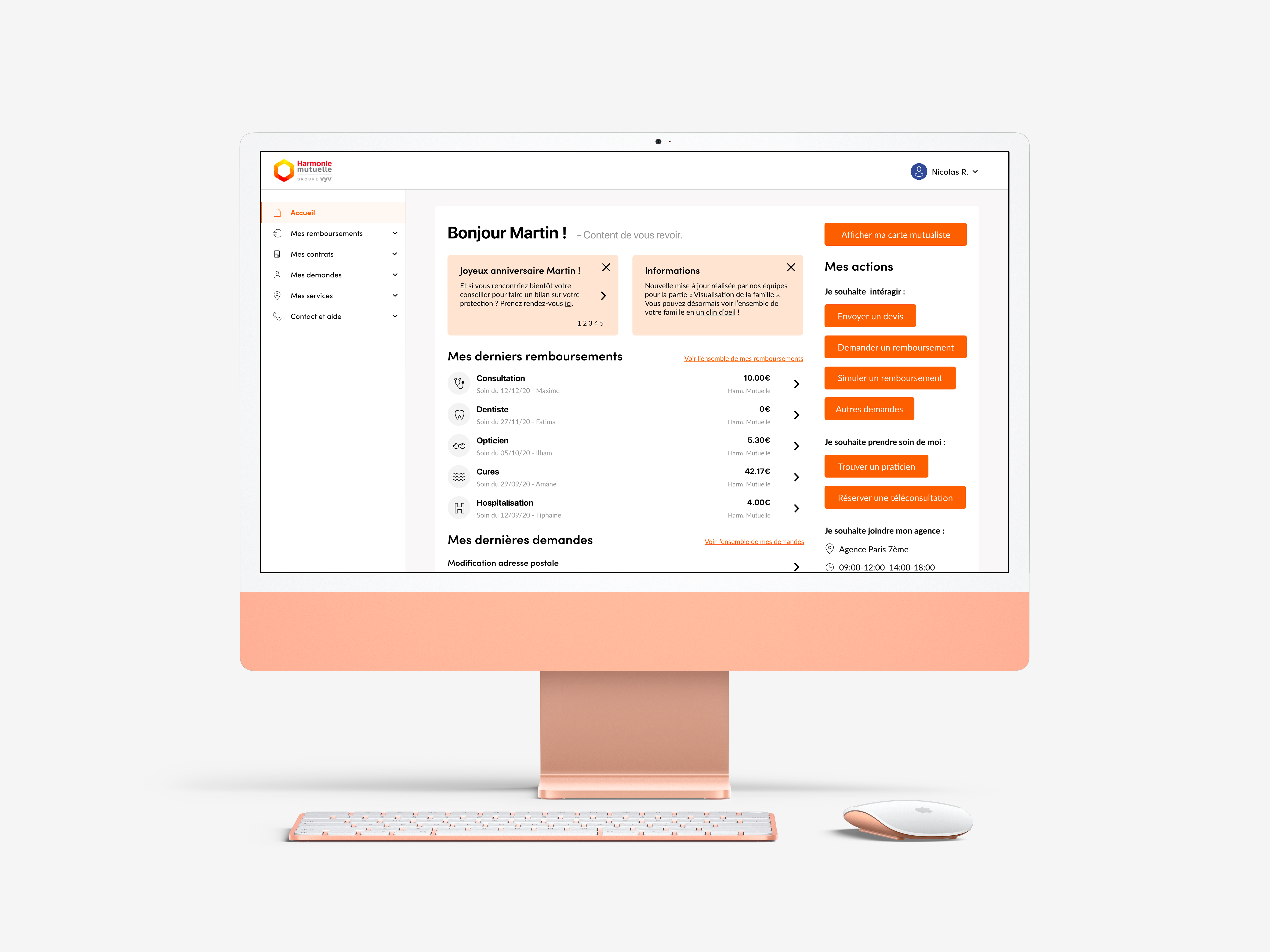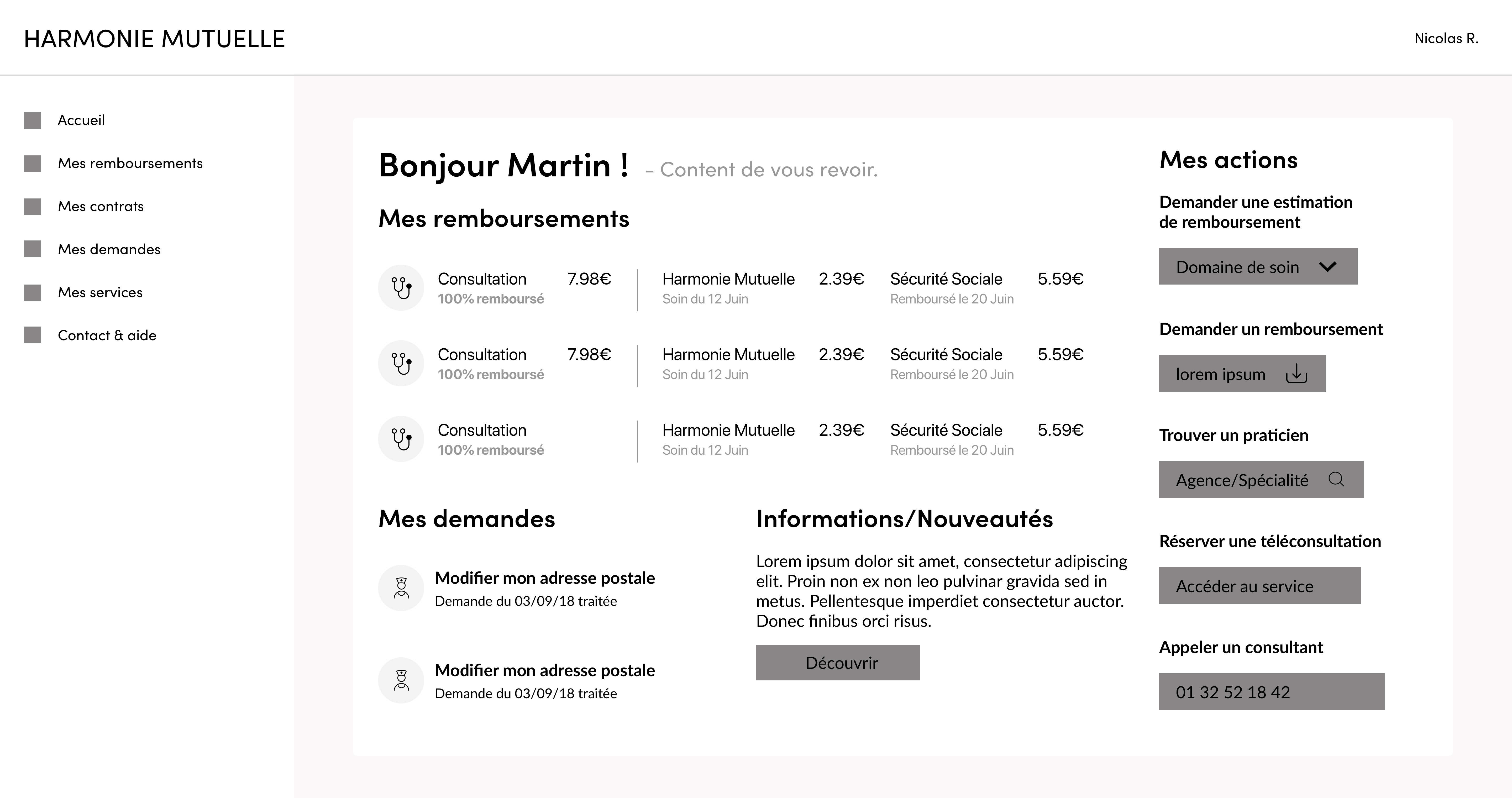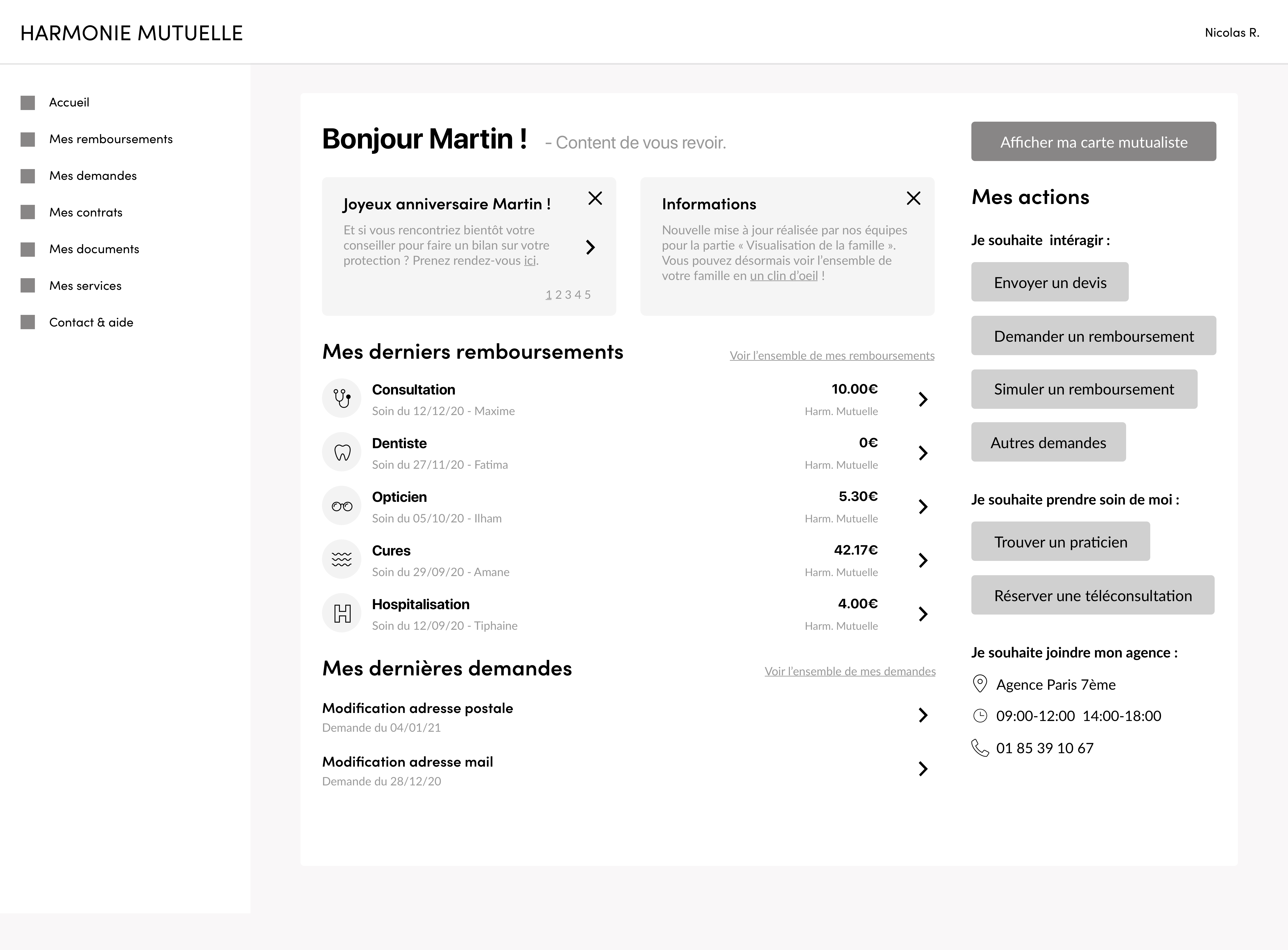 Le concept de cette page d'accueil est de permettre à l'utilisateur de visualiser ses dernières informations simplement et efficacement. Pour répondre à ce concept, je devais me poser la question de la pertinence des informations à afficher. J'ai d'abord défini les éléments, à savoir : les remboursements, les demandes, les contrats ainsi que les services. Après un atelier avec Fatima, j'ai itéré les éléments pour ajouter une liste d'action rapide.