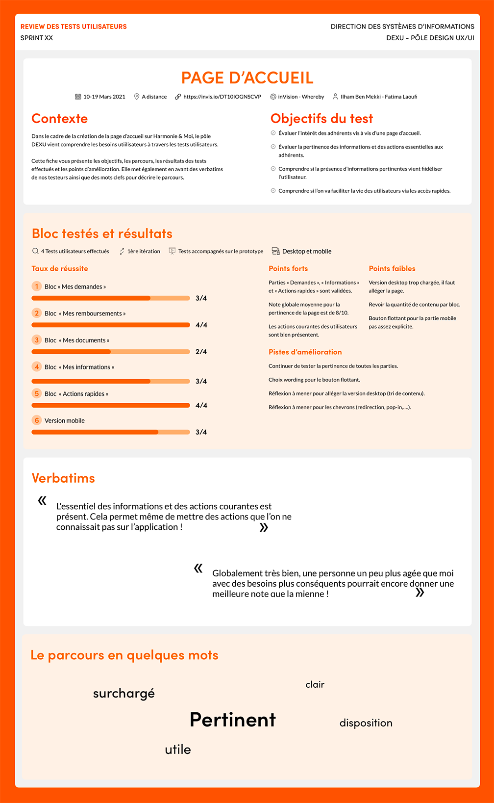 A mon arrivée, très peu voire aucuns tests étaient réalisés et donc, aucune restitution. Grâce à un bon travail de l'ensemble de l'équipe, nous avons commencé à mettre en place des tests utilisateurs. L'objectif était donc de les pérenniser et de les partager en interne pour montrer la pertinence de nos travaux.